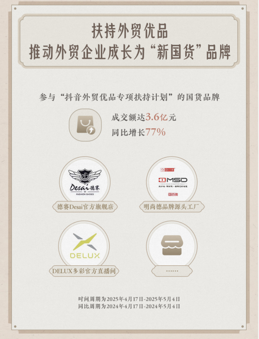 在全球贸易格局深度调整的背景下,外贸企业转向国内市场销售已成为经济发展的新趋势。这些外贸企业在产品生产经营和质量管控方面积累了丰富经验,然而,由于缺乏国内市场渠道和品牌知名度,在转内销过程中面临诸多挑战。多家电商平台采取开设外贸优品专区、提供流量扶持、搭建产销对接通道等举措,协助外贸企业解决库存积压问题,助力其成功实现“出口转内销”的转变。报告数据显示,2025年4月17日—5月4日,参与“抖音外贸优品专项扶持计划”的国货品牌成交额达3.6亿元,同比增长77%。其中,德赛鞋业面临出口贸易严重受阻的困境,依托“内外双循环”战略,持续深耕直播电商领域,该企业拓展了更多新市场,销量实现了50%至100%的增长。这种转型不仅有效盘活了企业的存量资源,还催生了一批兼具国际标准与本土特色的“新国货”,丰富了国内消费市场的供给,推动形成了“国内国际双循环”相互促进的新发展格局。