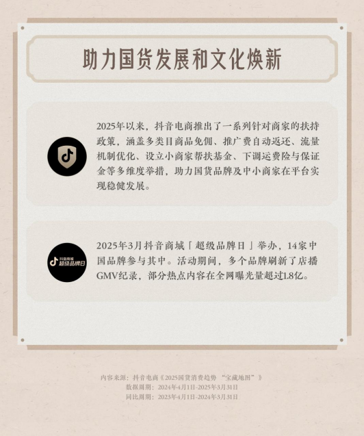 电商平台的助力,也为国货品牌崛起搭建广阔舞台。2025年以来,抖音电商推出多类目商品免佣、推广费返还、流量机制优化、设立小商家帮扶基金、下调运费险与保证金等多项扶持政策,助力国货品牌及中小商家稳健发展。今年品牌日前夕,抖音电商发布的报告显示,店播驱动生意增长,六成国货品牌成交额翻倍。这些数据充分印证了国货消费热潮的真实性和电商平台在推动国货发展中的重要作用。