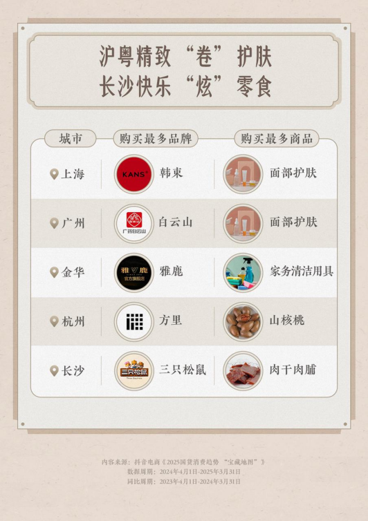 随着我国经济社会的快速发展,消费者的行为更趋理性,更加注重产品的实际效用,不再盲目追捧“洋品牌”,而是以理性务实的态度评估产品价值。许多国货企业敏锐地察觉到消费升级的需求,根据本土消费的特点,设计并推出具有特色的产品。同时,电子商务、直播带货等新兴购物模式,也使众多国货进入消费者的视野。《2025抖音电商国货消费趋势“宝藏地图”》(以下简称报告)数据显示,“90后”“00后”“80后”等年轻群体成为国货消费主力军,其中“00后”消费增速尤为显著。上海、广州、金华、杭州和长沙在国货消费城市中排名前五。国货凭借其“诚意”与“实力”,成为广大消费者和年轻一代表达文化认同和个性态度的新选择。