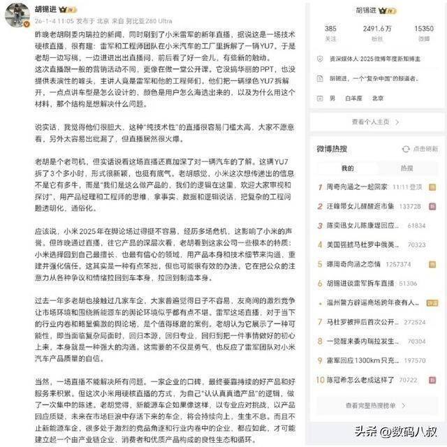 作为一名老司机,胡锡进坦言,这场直播加深了对一辆汽车的了解。他认为,小米选择了自己最擅长、也最有信心的领域——用产品本身和技术细节来沟通,重建并强化信任。这是一种笨办法,却可能非常有效。