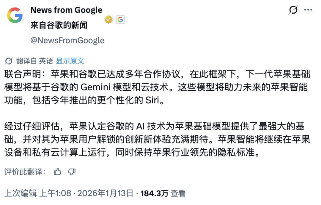 当地时间1月12日晚,苹果和Google发布联合声明,双方达成达成多年深度合作协议。下一代「苹果基础模型」将直接基于 Google的Gemini模型和云技术构建。