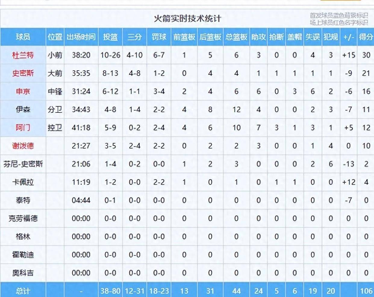 与此形成鲜明对比的是球队的两位核心。 砍下30分6篮板的杜兰特,因其关键时刻的连续失误和绝平球不中,被评为“不及格”。 他全场26投10中的效率也备受诟病。 而申京虽然数据单上有16分6篮板6助攻3盖帽,但他同样出现了6次失误,并且在防守端被对手频频针对,唐斯在他面前予取予求。 他除了第二节表现尚可,其余时间被批评为“打球软弱”,在场时球队净负分。