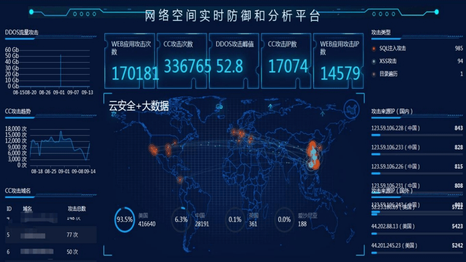 可视化管理:态势感知大屏实时展示DDOS/CC攻击趋势、Web应用攻击次数、恶意IP分布等数据,攻击日志可追溯,防护效果一目了然;