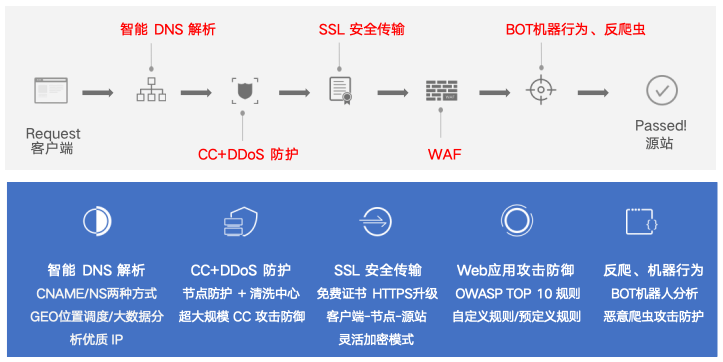 快速接入:支持CNAME/NS两种解析方式,分钟级配置完成,无需源站改造升级,企业零技术门槛即可上手;