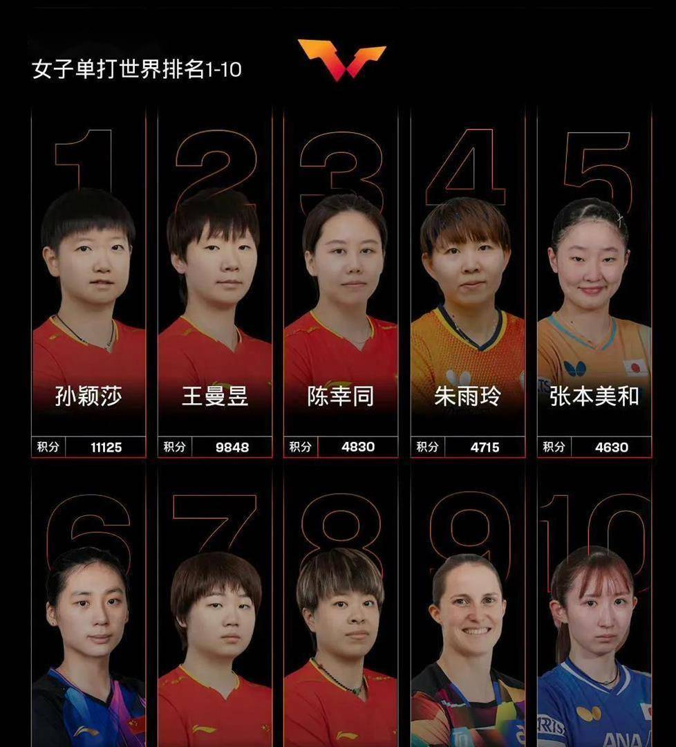 与此同时,国际乒联在本周更新了世界排名,其中出现了几个关键变动。 在女单方面,最大变动就是蒯曼跌出前5,陈熠成功反超。 虽然女单世界前三依旧是国乒包揽,但是陈幸同第三的位置并不稳,朱雨玲、张本美和与她的差距就在一两百分。具体排名显示,孙颖莎、王曼昱、陈幸同位列前三,陈熠位列第六,蒯曼位列第七。男单方面,王楚钦以11725分依旧断崖式稳定榜首。 国乒男队只有王楚钦一人位居男单世界前五。