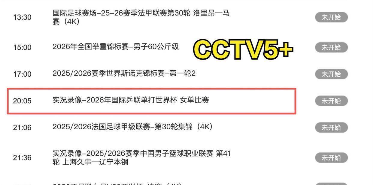 根据央视最新的节目安排,4月21日晚上,球迷们可以在电视上重温国乒在单打世界杯上的表现。 具体时间是晚上6点30分,CCTV5频道播出《实况录像-2026年国际乒联单打世界杯 男单比赛》。 紧接着在晚上8点05分,CCTV5+频道播出女单比赛的实况录像。 这些比赛录像的播出,被看作是大赛前帮助球迷回顾国乒选手状态、营造比赛氛围的一种方式。
