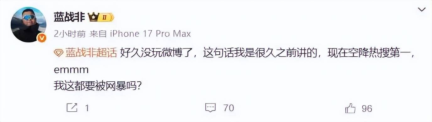 蓝战非随即发文回应:“好久没玩微博了,这句话我是很久之前讲的,现在空降热搜第一,我这都要被网暴吗?”