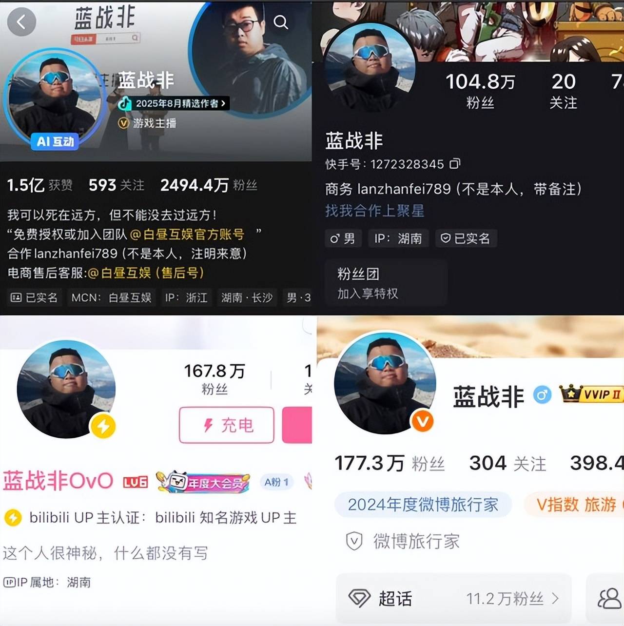 2025-10-01斗鱼,斗鱼直播,斗鱼APP,游戏直播,电竞直播,手游直播,lol直播,英雄联盟直播,dnf直播,cf直播,绝地求生直播,王者荣耀直播,二次元直播,英雄联盟,绝地求生,和平精英,魔兽世界,三角洲截至25日,蓝战非在抖音平台的粉丝为2494.5万,小红书粉丝为13万。