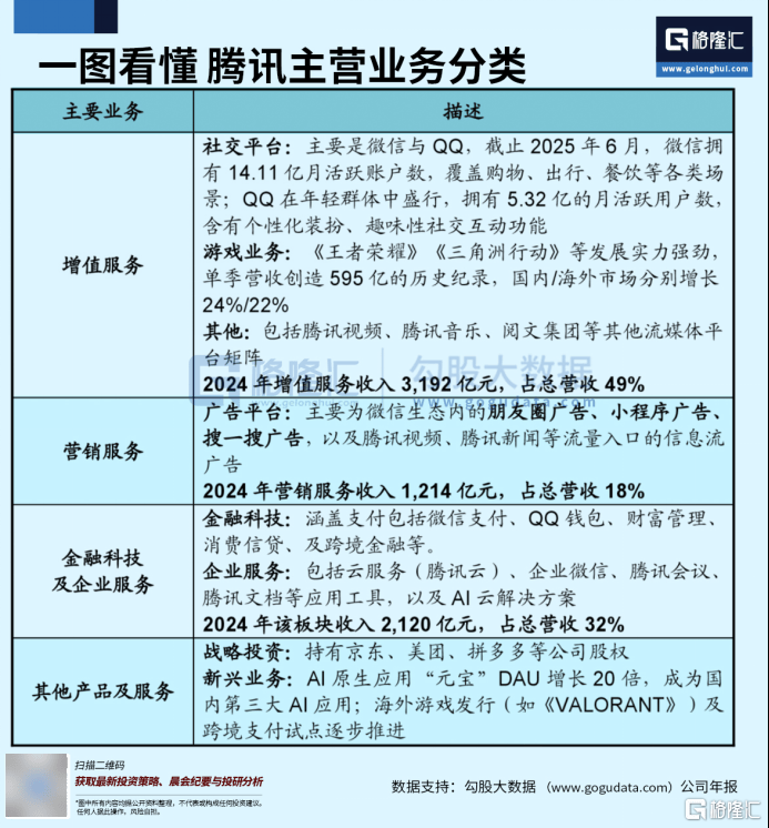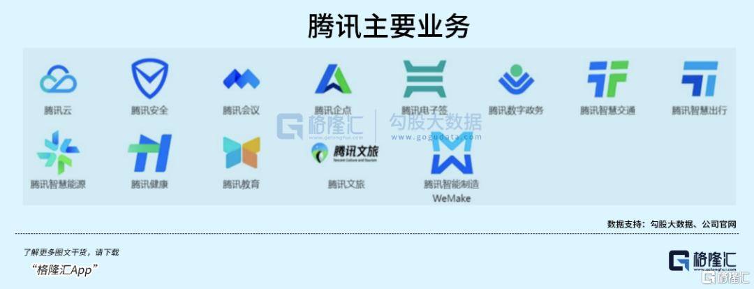 金融科技涵盖微信支付、QQ钱包、财富管理、消费信贷及跨境金融等,依托社交生态实现高频场景渗透;企业服务包括腾讯云、企业微信、腾讯会议、腾讯文档等应用工具,以及AI云解决方案,在政企、金融与产业互联网领域积累深厚,为后续AI赋能打下坚实基础。