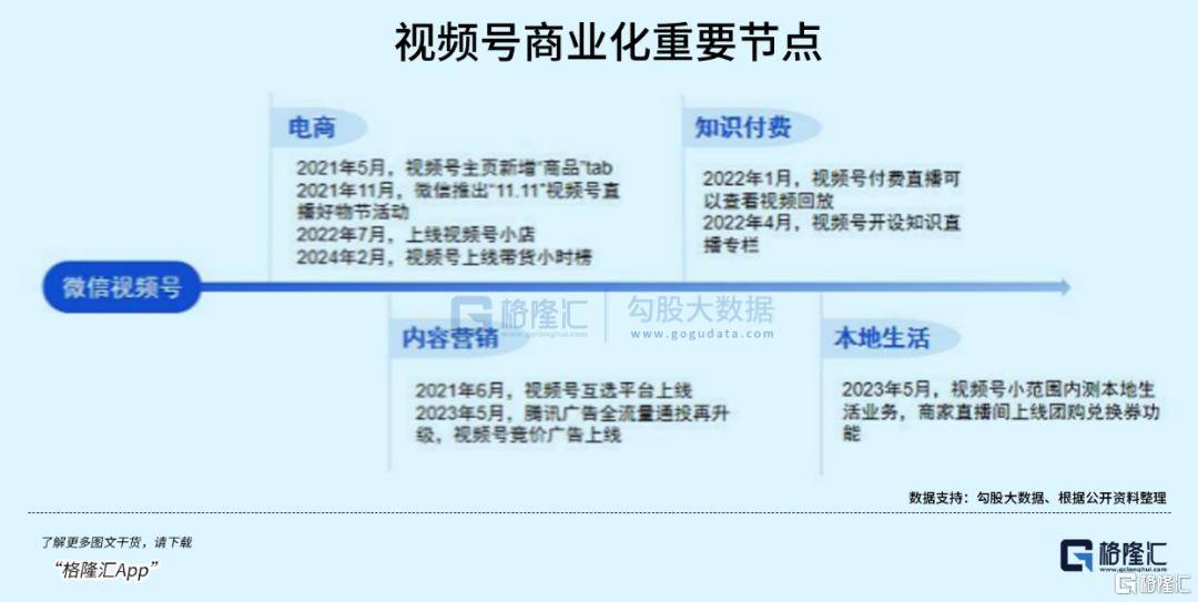 随着直播电商、广告、创作者体系逐步成熟,视频号商业化加速落地:上线带货小时榜、打通小程序交易、推出竞价广告,2023年小范围内测本地生活业务,商家直播间上线团购兑换券功能,通过“11.11视频号直播好物节”等活动激活交易场景。
