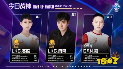 拿下了最终的冠军,以183分的总分强势领跑积分榜。比赛中LGK.雨果用比赛中的操作展示了自己的实力,凭一己之力完成个人淘汰21的优异战绩,可谓含金量十足的战神,场场持续输出,带领队员走向胜利,