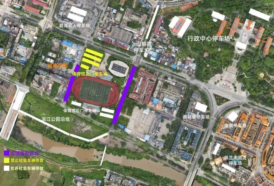 (三)周边关联道路停车建议。观看赛事的本地群众请采取公共交通或者驾驶摩托车、电动车等便捷的交通工具前往,就近的群众请采取步行方式前往。驾驶车辆的群众请在以下地点停放:民族体育馆后门区域停车位有序停放、南腊路至河边公园断头路路段单向顺序停放、山榕路县一小路段道路两侧停车泊位有序停放、碧海云天商业区空位停放、行政中心总工会停车场空位停放、金阁停车场空位停放、雨林居酒店停车场空位停放、景兰大酒店停车场空位停放。